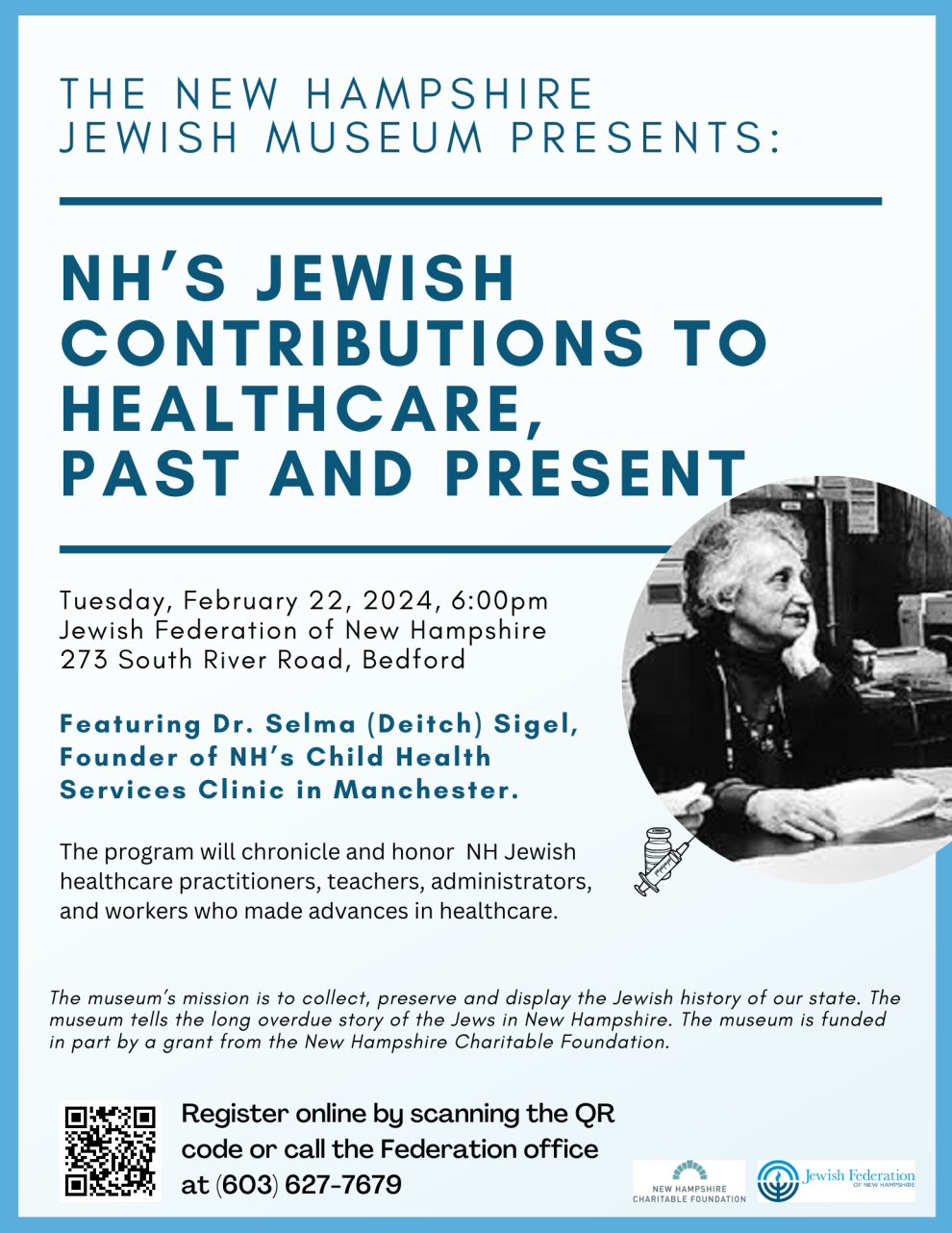 On Thursday, February 22, 2024 at 6 PM, the New Hampshire Jewish Museum (NHJM) located in the Jewish Federation of NH in Bedford, will open an exhibit entitled “NH Jewish Contributions to Healthcare, Past and Present.”