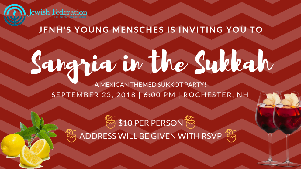 Sangria in the Sukkah is a Mexican themed Sukkot party, which will be hosted by Noam Wolf NH Shlicha, Ashley Gabrielle and Jewish Federation of New Hampshire!