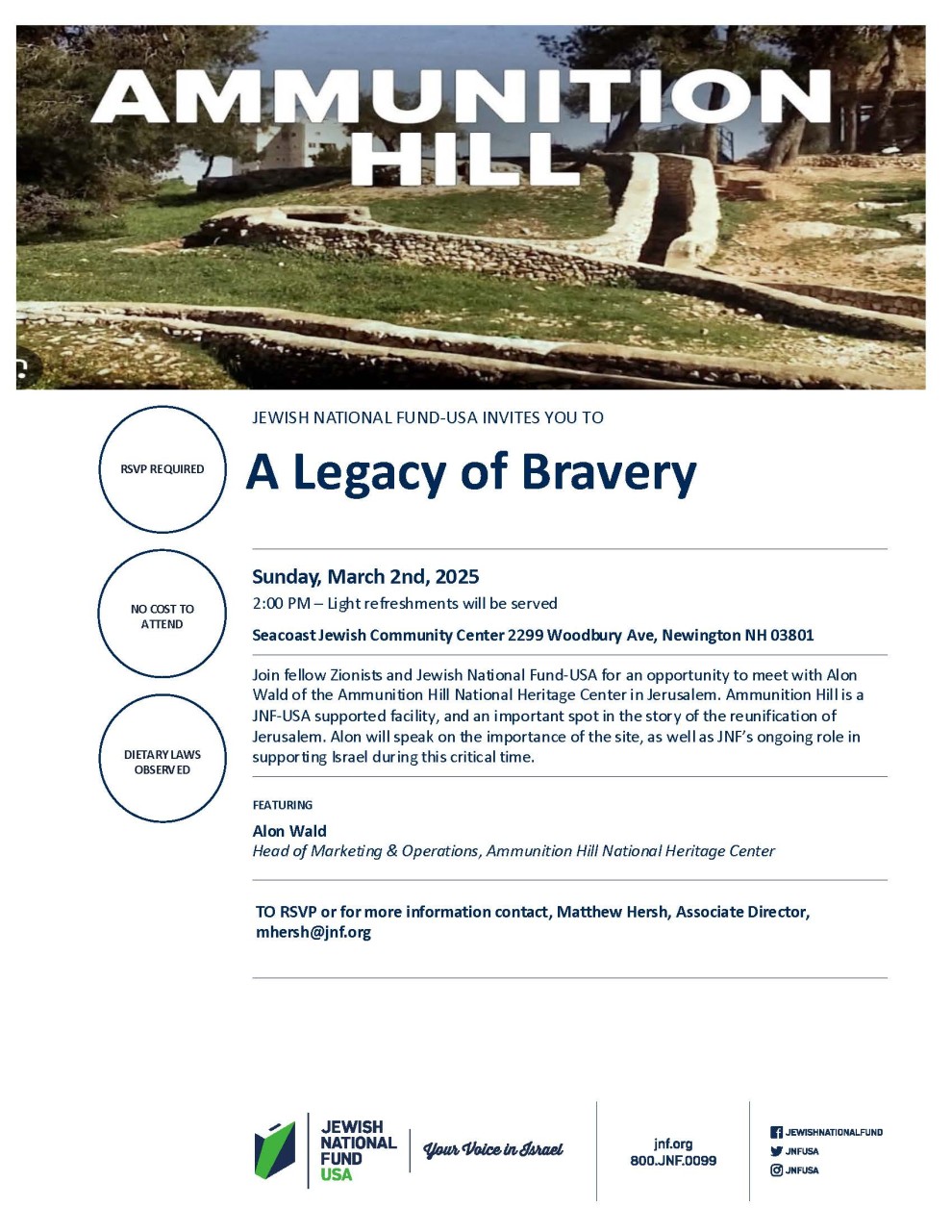 Join fellow Zionists and Jewish National Fund-USA for an opportunity to meet with Alon Wald of the Ammunition Hill National Heritage Center in Jerusalem. Ammunition Hill is a JNF-USA supported facility and an important spot in the story of the reunification of Jerusalem. Alon will speak on the importance of the site, as well as JNF’s ongoing role in supporting Israel during this critical time.