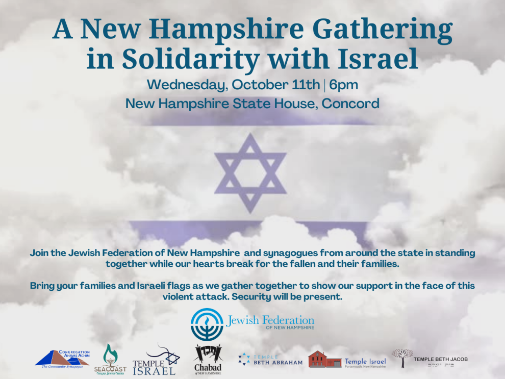 Join the Jewish Federation of New Hampshire and synagogues from around the state in standing together while our hearts break for the fallen and their families. Bring your families and Israeli flags as we gather together to show our support in the face of this violent attack. Security will be present.