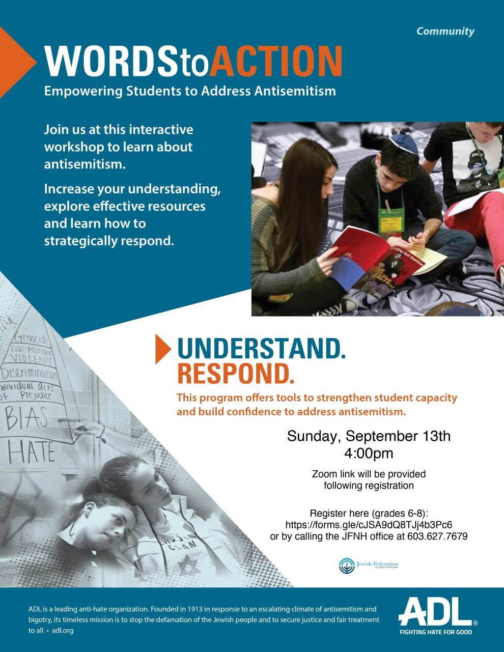 The Jewish Federation of New Hampshire is excited to welcome the ADL back for Words to Action.This program is approximately 1 1/2 hours and is for students in Middle School (Grades 6-8). The program is designed to help students increase their understanding of anti-Semitism and the way it manifests itself, including anti-Semitism that is fueled by anti-Israel sentiment; increase their awareness of incidents of anti-Semitism in their environment; improve their ability to address specific incidents of anti-Semitism and/or anti-Israel bias and to select appropriate responses; develop and use a variety of preventive and reactive responses to challenge incidents of anti-Semitism and/or anti-Israel bias; increase their ability to apply critical thinking and problem-solving skills to address anti-Semitism and anti-Israel bias; and enhance their leadership skills by developing a willingness, motivation and commitment to take personal action against anti-Semitism.