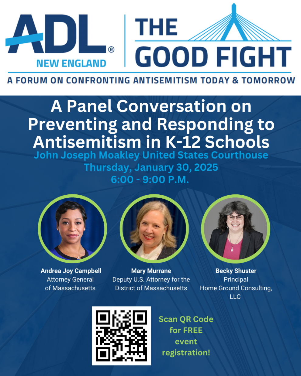 Join us for a panel conversation on preventing and responding to antisemitism in K-12 schools. Massachusetts Attorney General Andrea Campbell and a representative from the US Attorney's Office will address how their offices can help respond to this hate. They and others will provide strategies for parents/caregivers, educators, and administrators to address antisemitism in schools.