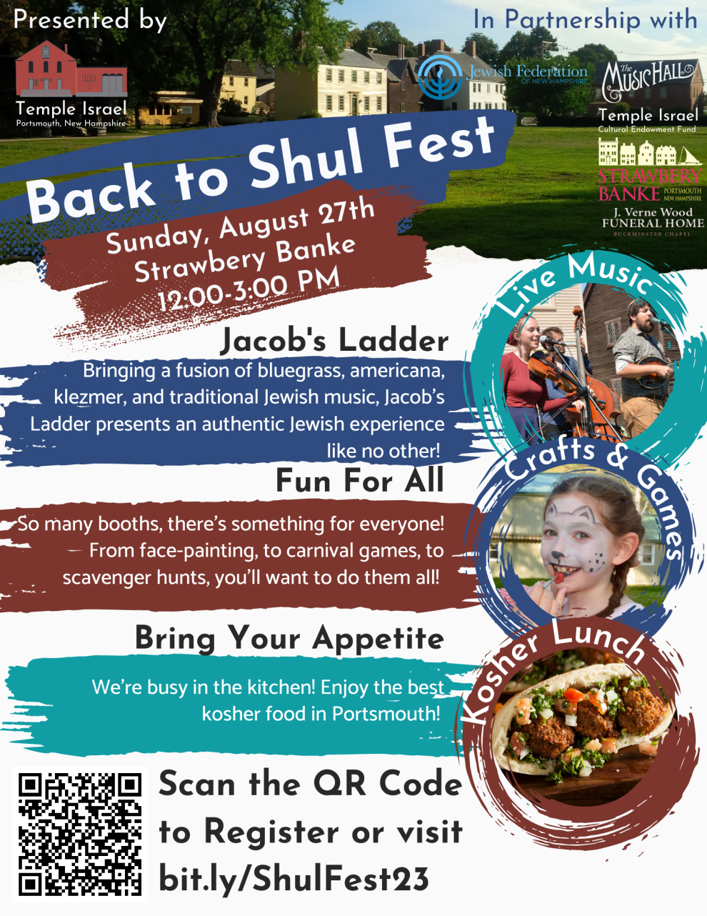 Join Temple Israel Portsmouth and a few hundred of your best friends at the big field at Strawbery Banke for an afternoon of music, food, games! Featuring live music by Jewish bluegrass sensation, Jacob's Ladder, a kosher lunch, and free games and activities with everything from face painting to card making, and (maybe even) a dunk tank!