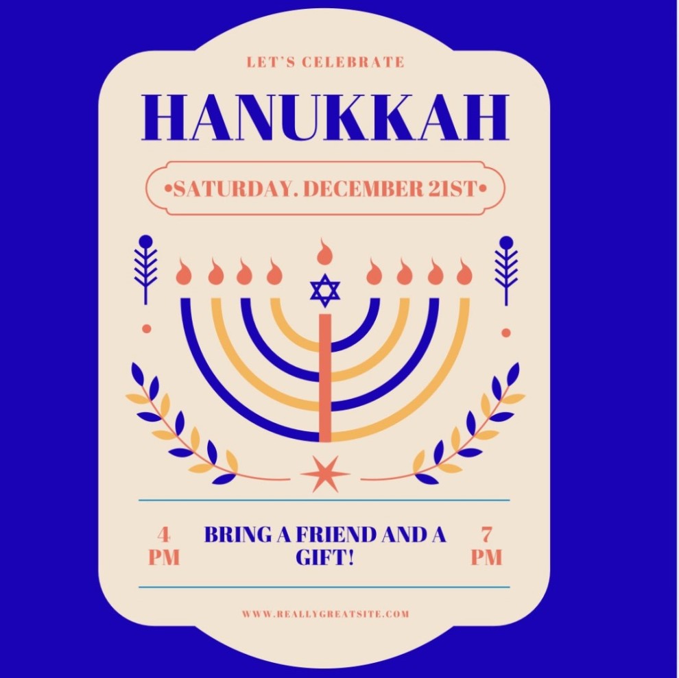 Our next event is on December 21st from 4-7pm. This event will be a fun mix of Hanukkah games and celebrations! Everyone attending will be expected to bring a gift (between $5-20) for a holiday swap and food will be provided.