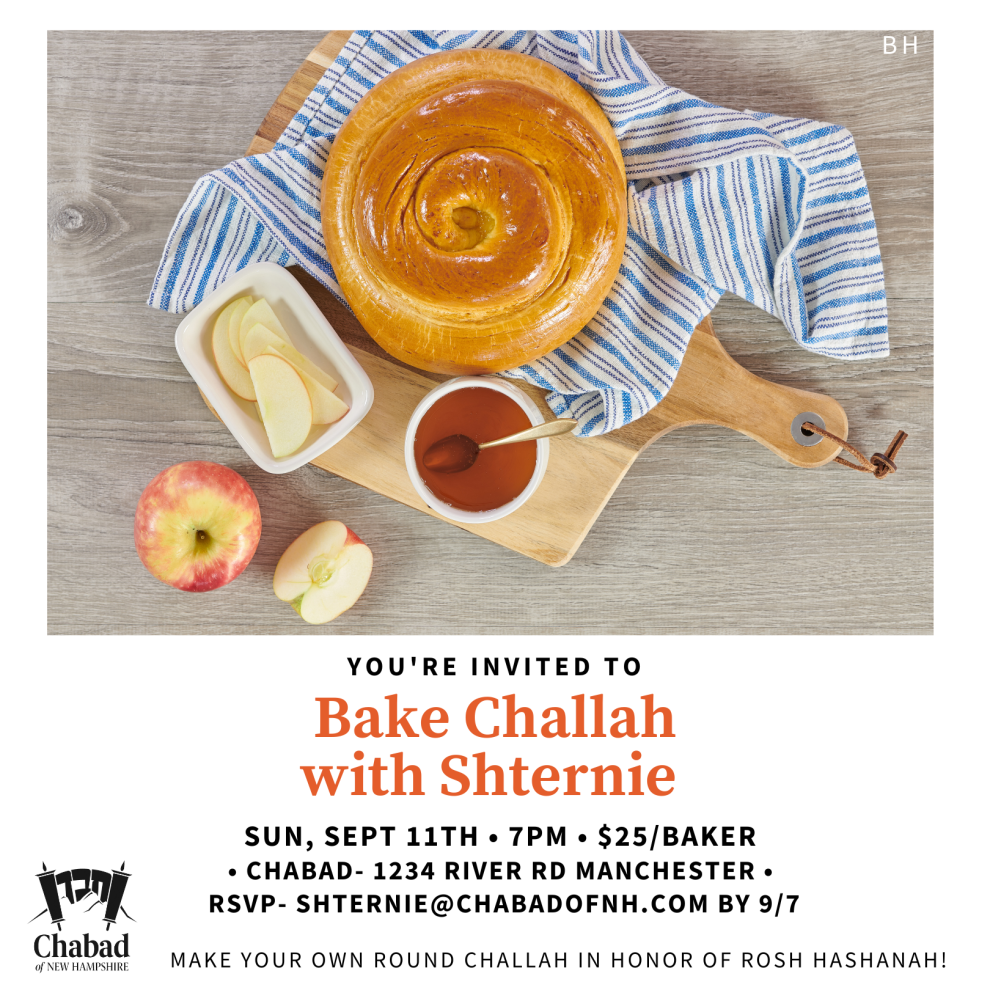 Be a part of New Hampshire's largest challah bake just before Rosh Hashanah! Join together with NH Jewish women to connect for an uplifting evening of unity and inspiration as we knead challah to adorn our high holiday tables.
