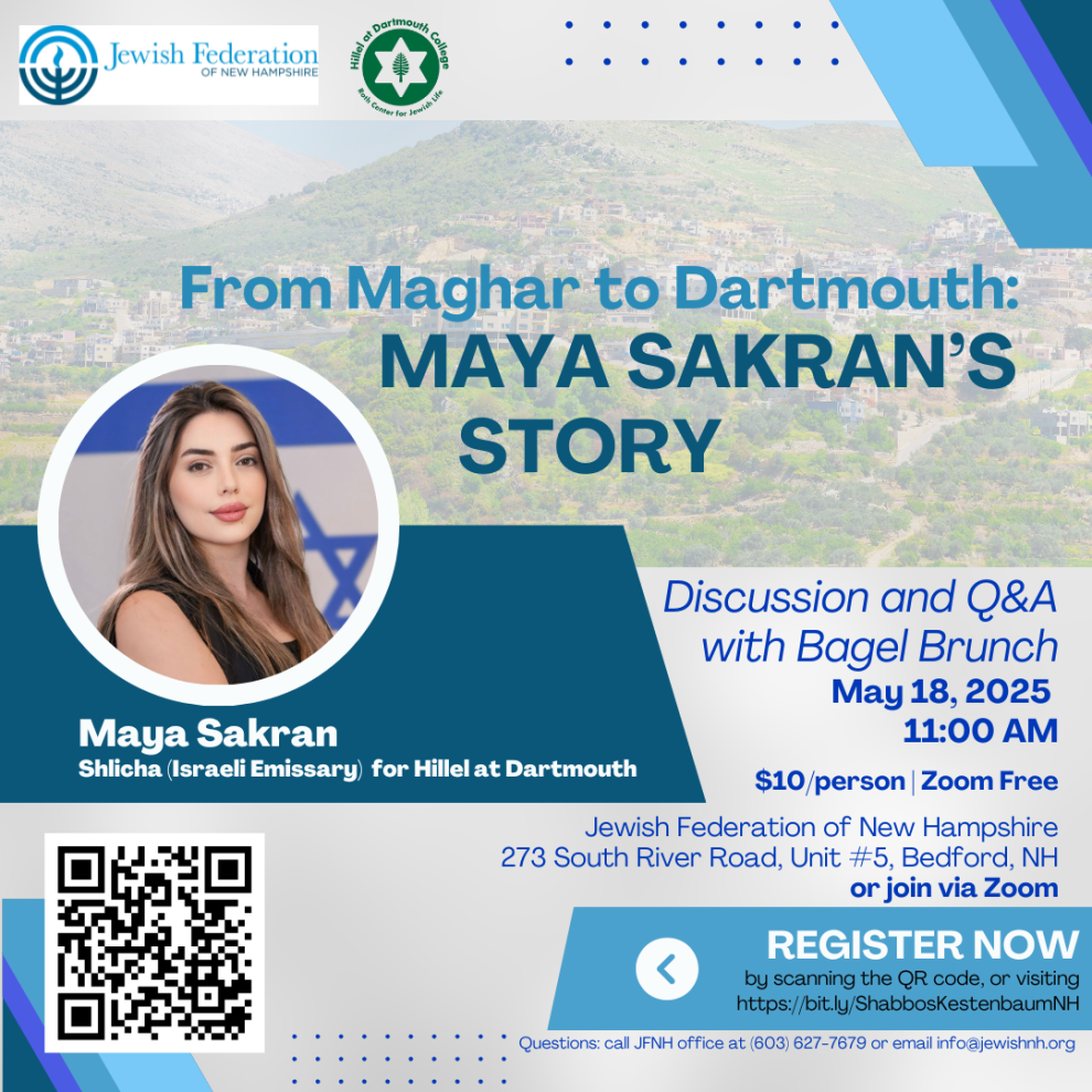 Maya is Israeli and a member of the Druze community. She is currently the Shlicha for Hillel at Dartmouth. Maya will join us for a discussion to share her story as a member of the Druze community, why she chose Shlichut, and her time as Shlicha at Dartmouth College. There will be and Question & Answer time as well.