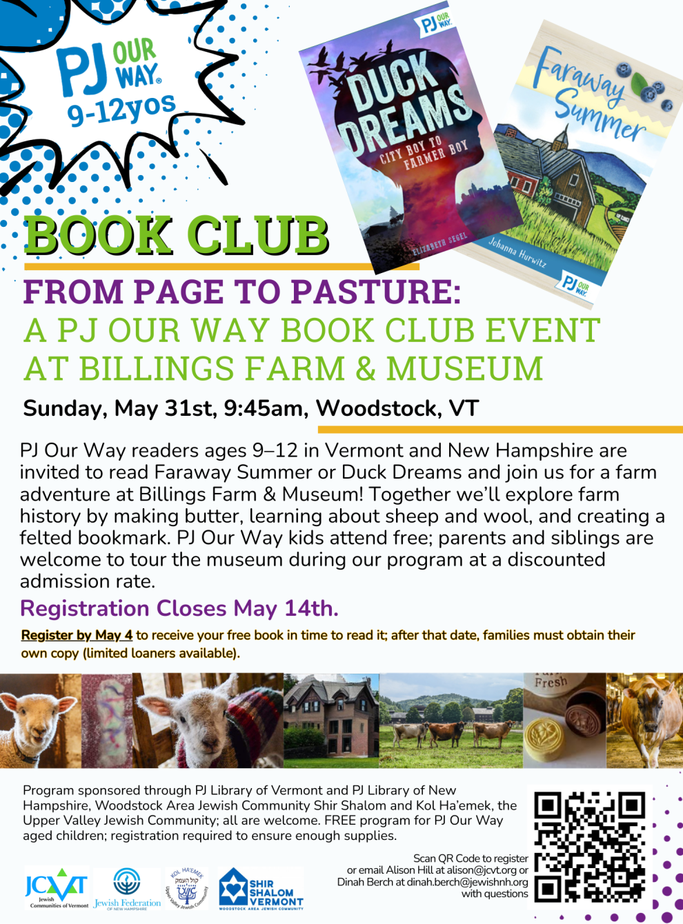 Sponsor: PJ Library of VT (JCVT), PJ Library of NH (JFNH), Shir Shalom, Kol Ha’emek Upper Valley Jewish Community
