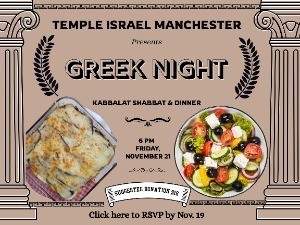 Feed Your Body, Feed Your Soul: Temple Israel Manchester presents GREEK NIGHT Kabbalat Shabbat and Dinner.