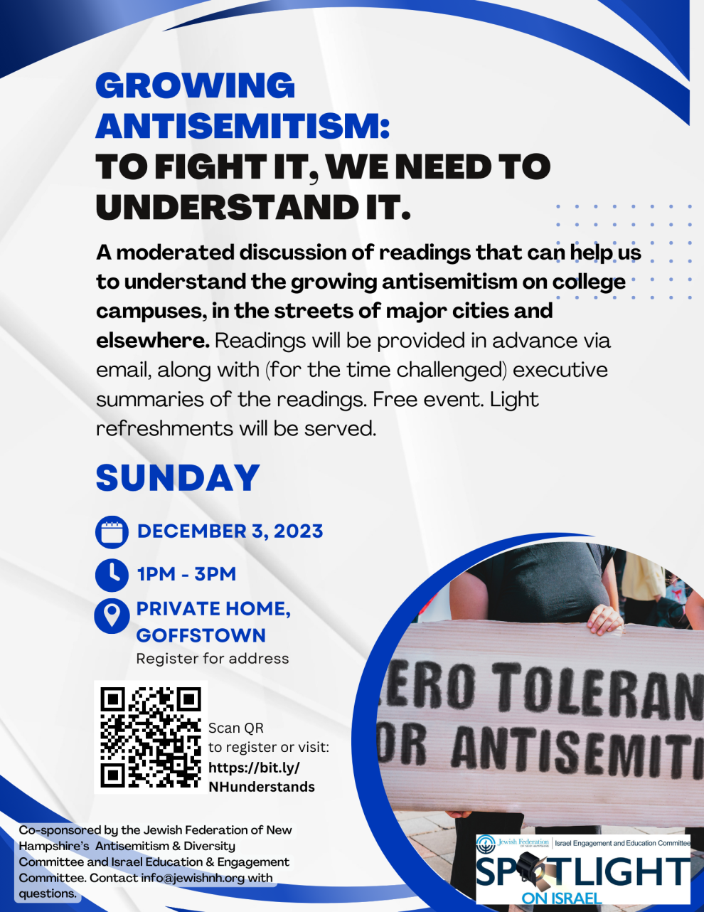 Please join us for a moderated discussion of readings that can help us to understand the growing antisemitism on college campuses, in the streets of major cities and elsewhere.