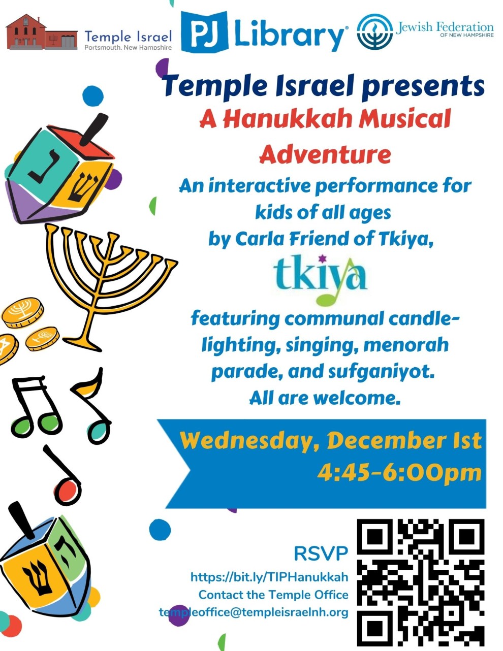 An interactive performance for kids of all ages by Carla Friend of Tkiya, featuring communal candle-lighting, singing, menorah parade, and sufganiyot. All are welcome; co-sponsored by PJ Library.