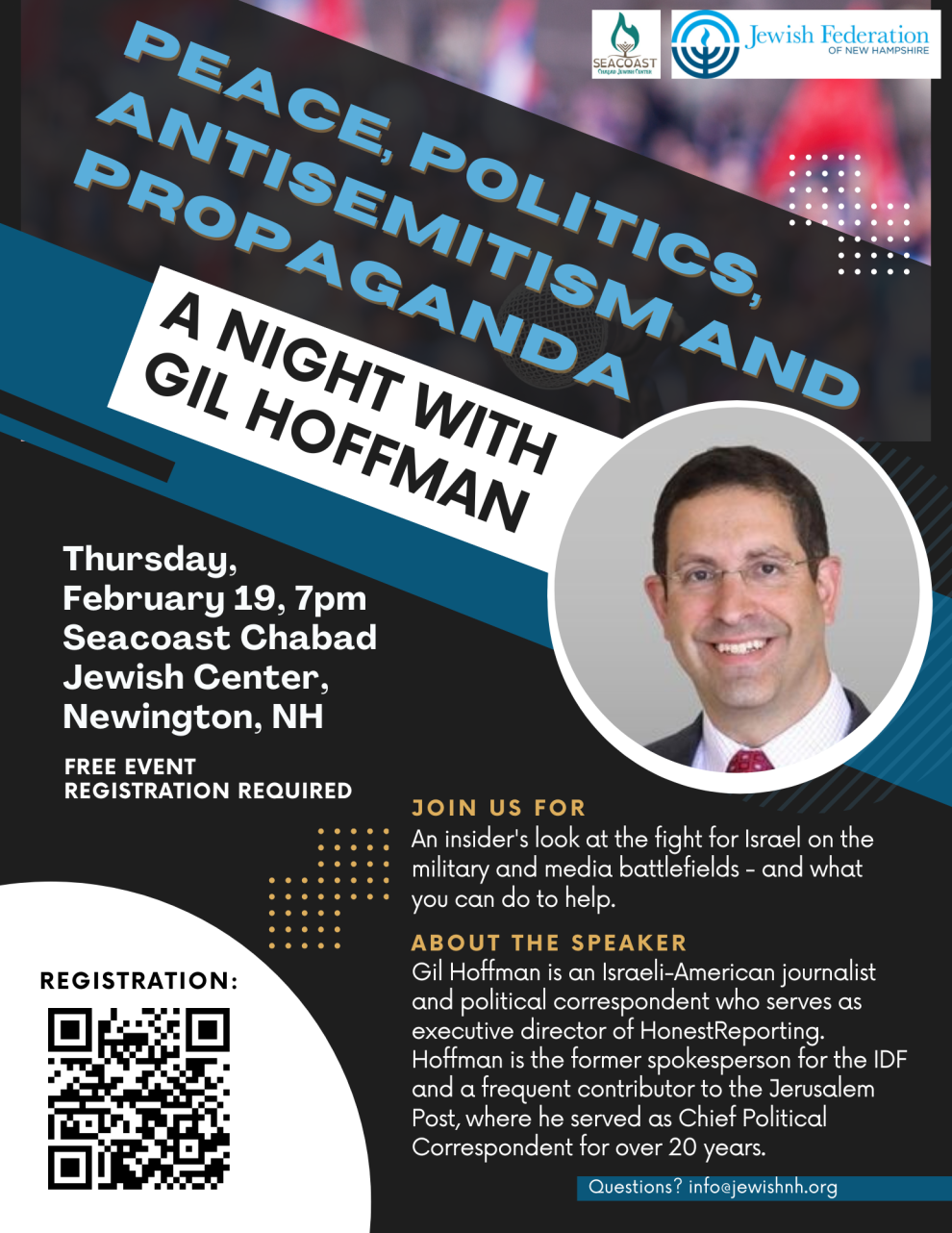 Join us to hear from Gil Hoffman,an Israeli-American journalist and political correspondent who serves as executive director of HonestReporting. He was previously chief political correspondent for the Jerusalem Post.