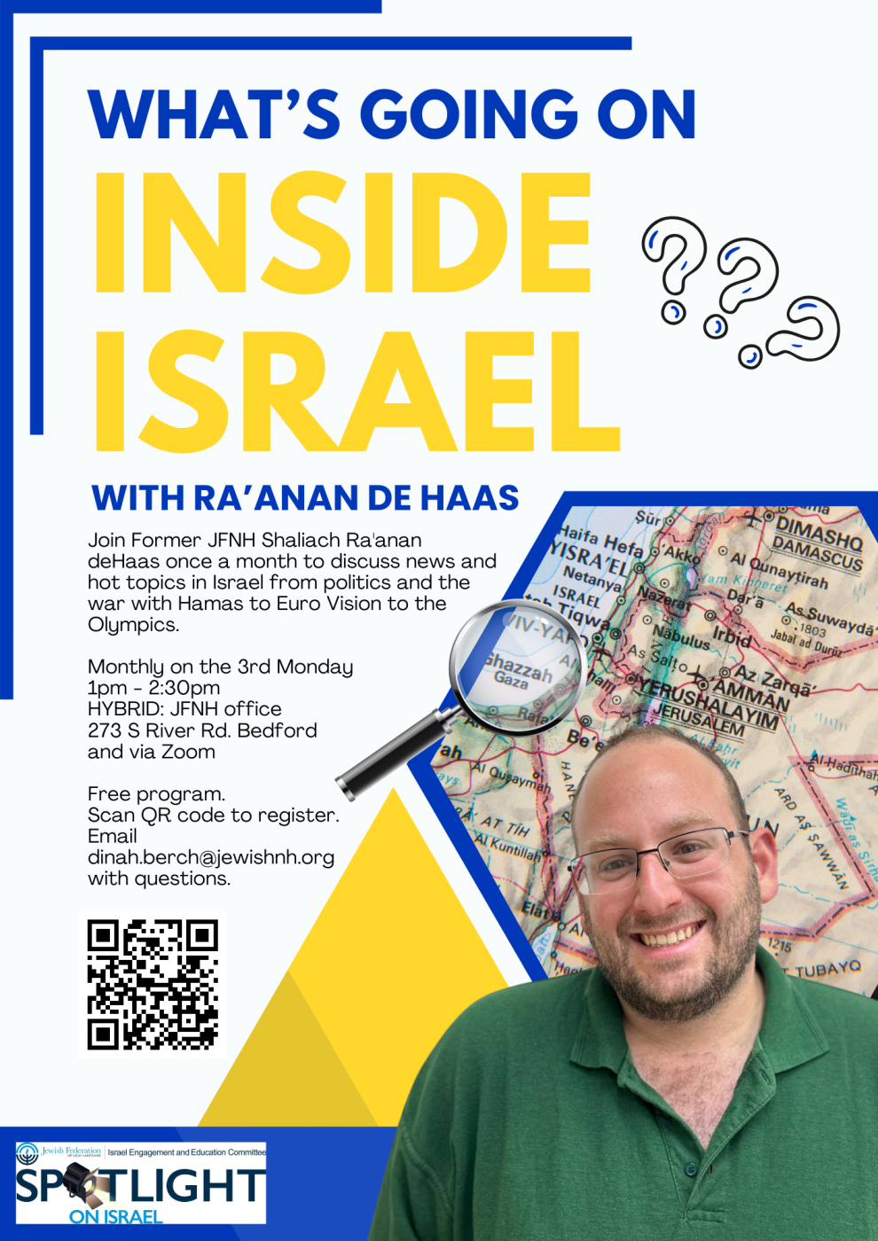 Join Former JFNH Shaliach Ra'anan de Haas to discuss news and hot topics in Israel