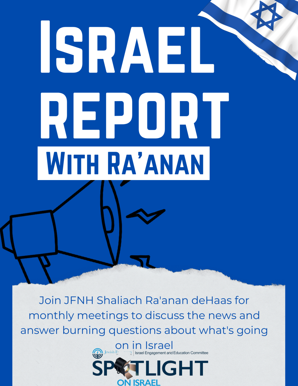 Join JFNH Shaliach Ra'anan deHaas to go over news in Israel.