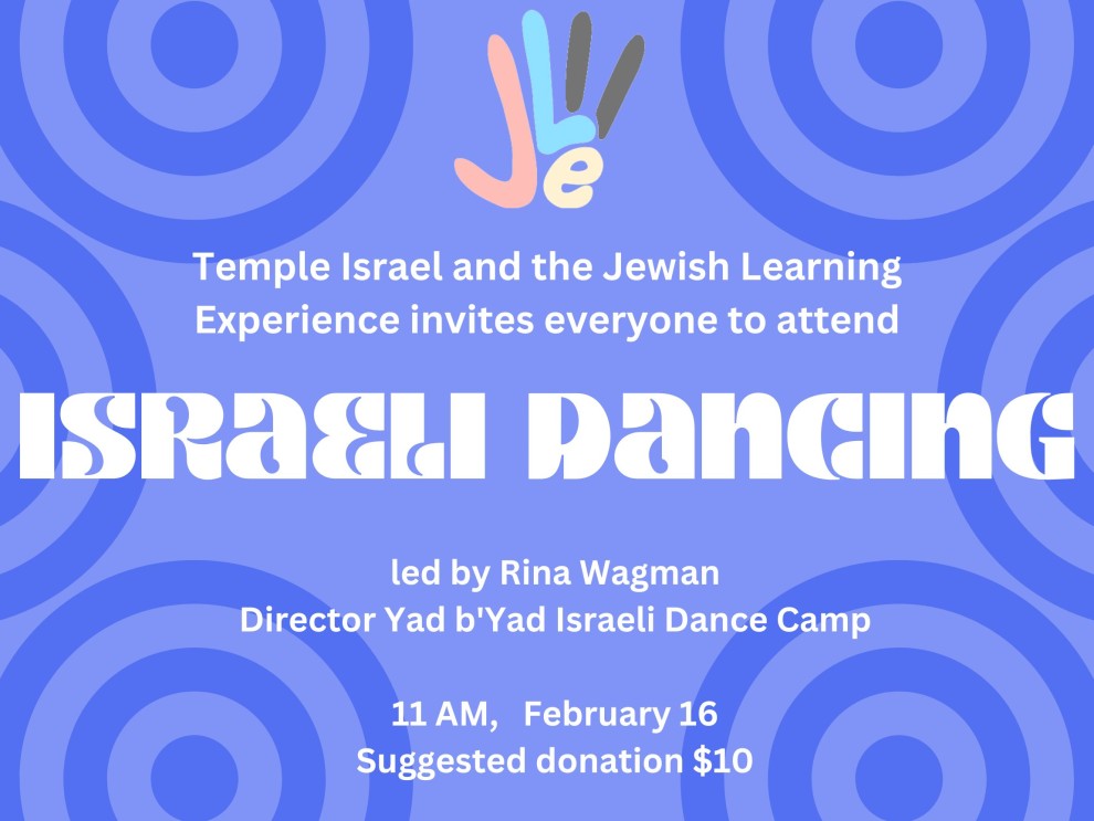 Temple Israel Manchester and the Jewish Learning Experience invites everybody to attend Israeli Dancing led by Rina Wagman director of the Yad b'Yad Israeli Dance Camp.
