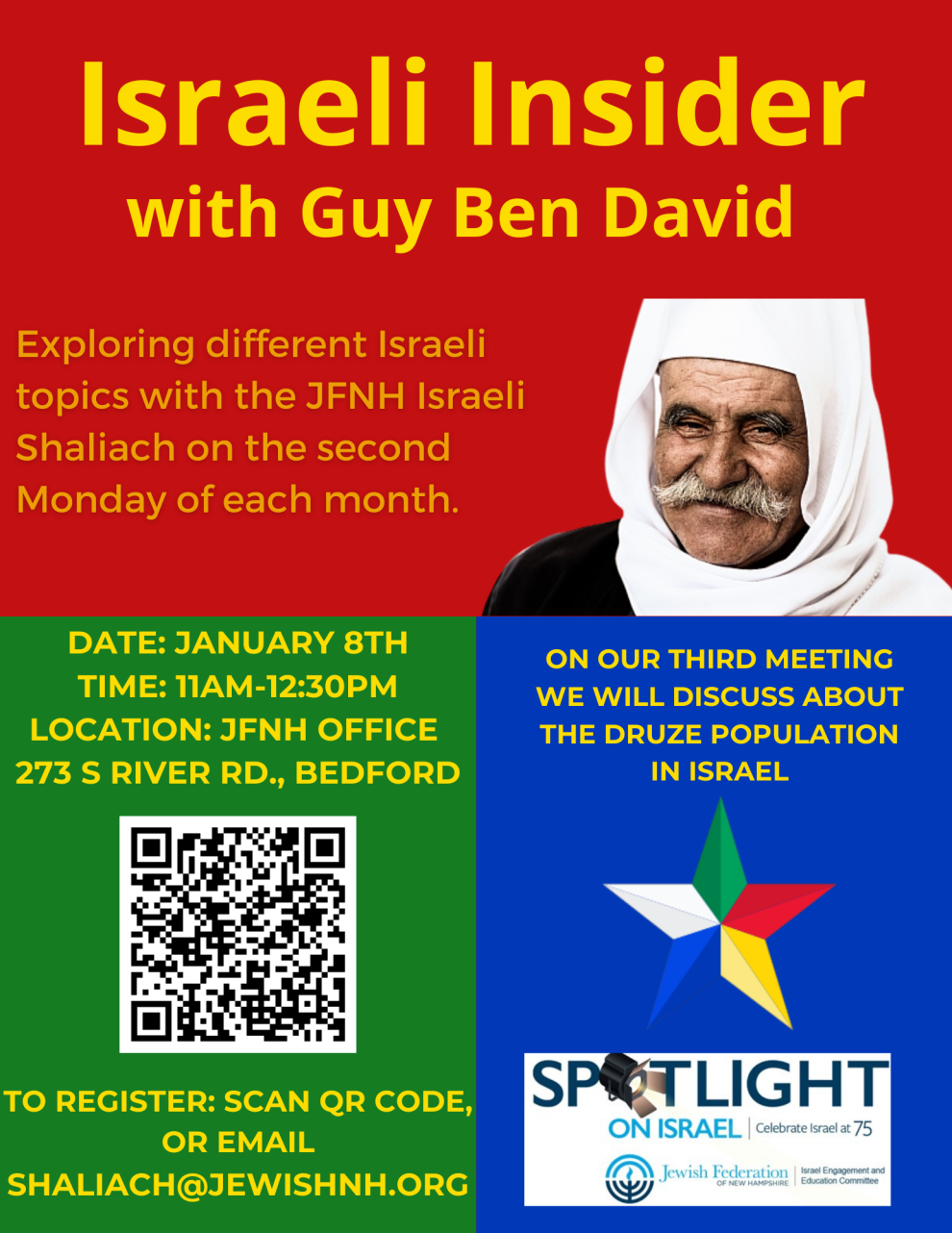 Join JFNH Shaliach Guy Ben David the second Monday of each month to discuss about different topics in Israel.