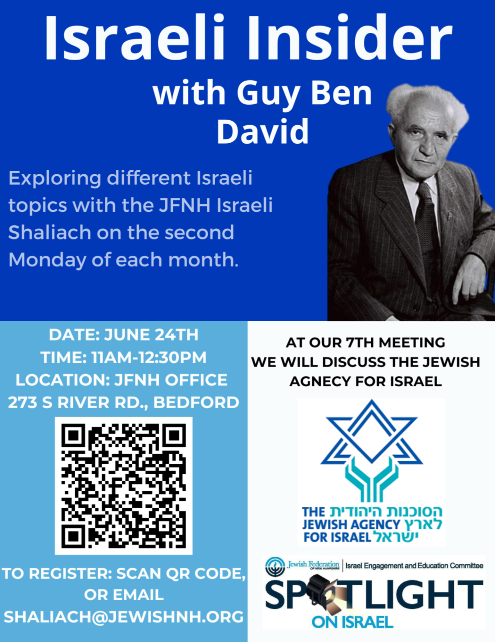 Join JFNH Shaliach Guy Ben David the second Monday of each month to discuss about different topics in Israel.