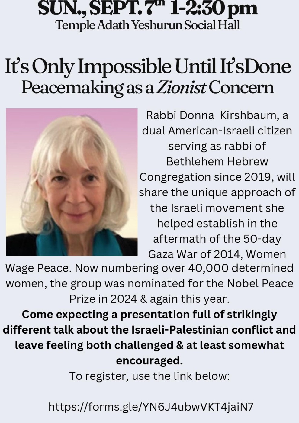 Rabbi Donna Kirshbaum, a dual American-Israeli citizen serving as rabbi of Bethlehem Hebrew Congregation since 2019, will share the unique approach of the Israeli movement she helped establish in the aftermath of the 50-day Gaza War of 2014, Women Wage Peace. Now numbering over 40,000 determined women, the group was nominated for the Nobel Peace Prize in 2024 and again this year.