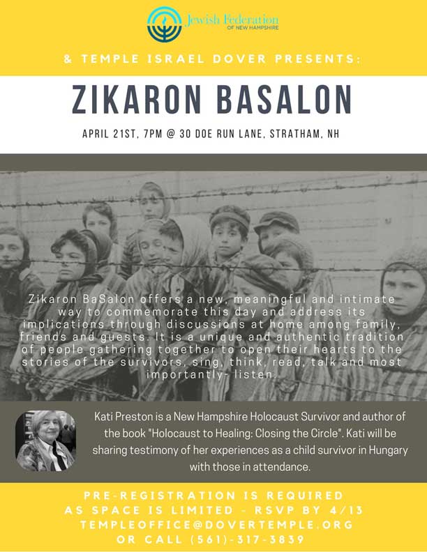 Zikaron BaSalon offers a new, meaningful and intimate way to commemorate this day and address its implications through discussion at home among family, friends and guests. It is a unique and authentic tradition of people gathering to open their hearts to the stories of the survivors, sing, think, read, talk and most importantly - listen. Kati Preston is a New Hampshire Holocaust Survivor and author of the book "Holocaust to Healing: Closing the Circle". Kati will be sharing testimony of her experiences as a child survivor in Hungary with those in attendance. Pre-registration is required as space is limited. More information and to RSVP: [email protected] or (561) 317-3839.