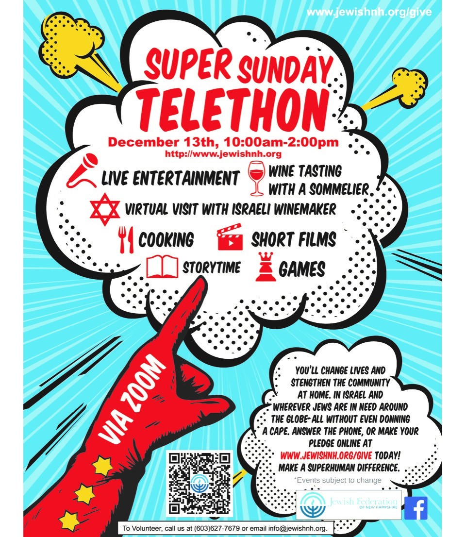 As a statewide organization we are charged with caring for the collective needs of all Jewish people in New Hampshire. It is thanks to the generous donations from our community to our Annual Campaign that allows us to continue our important work. So when your phone rings on Dec. 13th, be a Super Hero and answer the call!