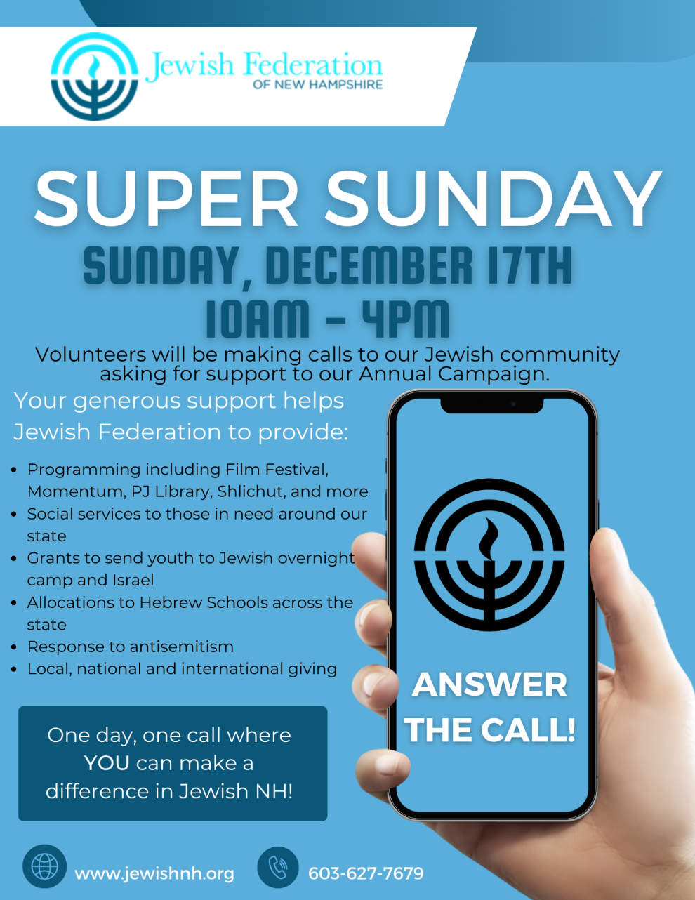 One day, one call where YOU can make a different in Jewish NH. Please ANSWER THE CALL!