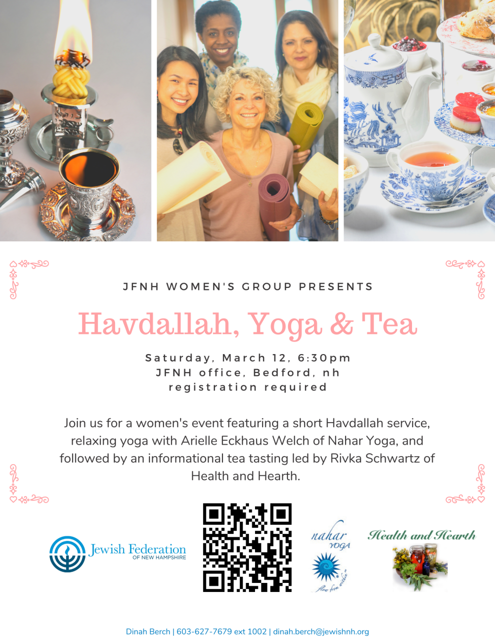 Join us for a women's event featuring a short Havdallah service, relaxing yoga with Arielle Eckhaus Welch of Nahar Yoga, and followed by an informational tea tasting led by Rivka Schwartz of Health and Hearth.