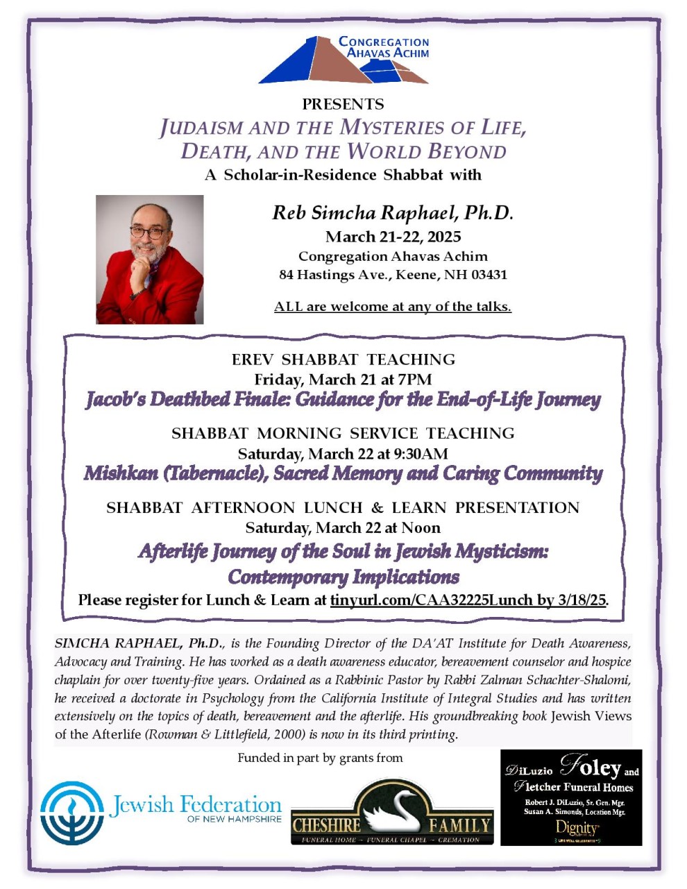 A Scholar-in-Residence Shabbat with Reb Simcha Raphael, Ph.D. covering two days of teachings and an afternoon lunch & Learn presentation.