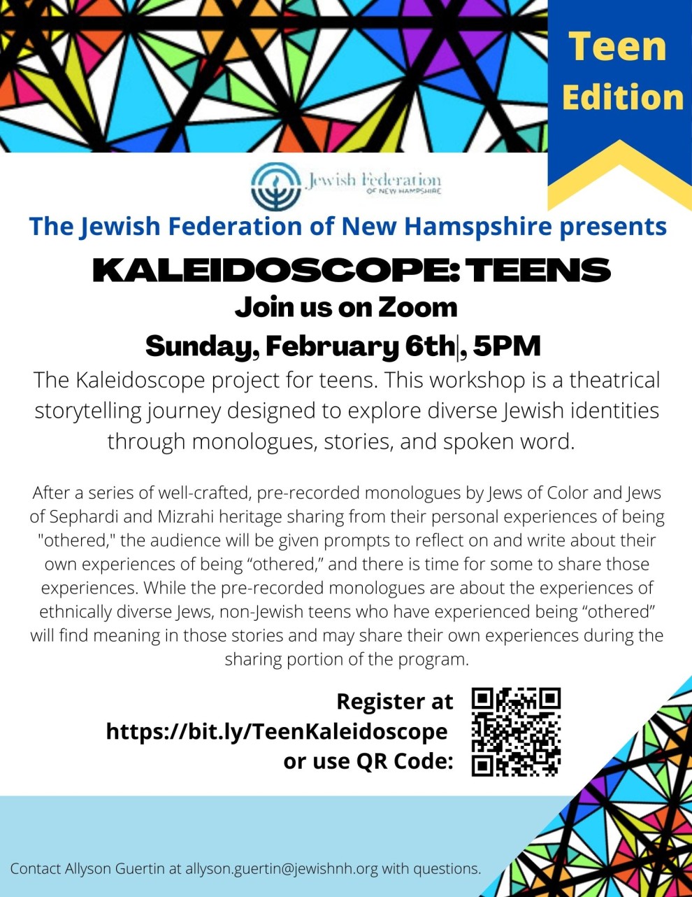 The Kaleidoscope project for teens. This workshop is a theatrical storytelling journey designed to explore diverse Jewish identities through monologues, stories, and spoken word. After a series of well-crafted, pre-recorded monologues by Jews of Color and Jews of Sephardi and Mizrahi heritage sharing from their personal experiences of being "othered," the audience will be given prompts to reflect on and write about their own experiences of being “othered,” and there is time for some to share those experiences. While the pre-recorded monologues are about the experiences of ethnically diverse Jews, non-Jewish teens who have experienced being “othered” will find meaning in those stories and may share their own experiences during the sharing portion of the program.