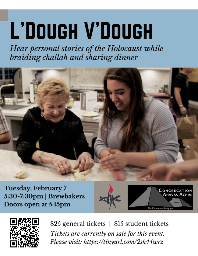 Every year, the Cohen Center for Holocaust and Genocide Studies holds an event in recognition of International Holocaust Remembrance Day. This year, we are hosting L'Dough V'Dough, which is a community storytelling and bread-baking event. In this program, Holocaust survivors (and others with a personal connection to the Holocaust) are seated at tables with students, community members, and other participants to share personal stories while braiding and baking challah bread together. The name for this event is a play on the Hebrew phrase "l'dor v'dor," which means "from generation to generation." Thus, L'Dough V'Dough programs are meant to cultivate deep relationships and forms of remembrance across generations.