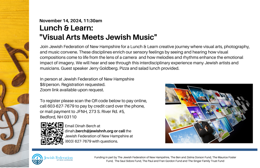 Join Jewish Federation of New Hampshire for a Lunch & Learn creative journey where visual arts, photography, and music convene. These disciplines enrich our sensory feelings by seeing and hearing how visual compositions come to life from the lens of a camera and how melodies and rhythms enhance the emotional impact of imagery. We will hear and see through this interdisciplinary experience many Jewish artists and musicians. Guest speaker Jerry Goldberg.
