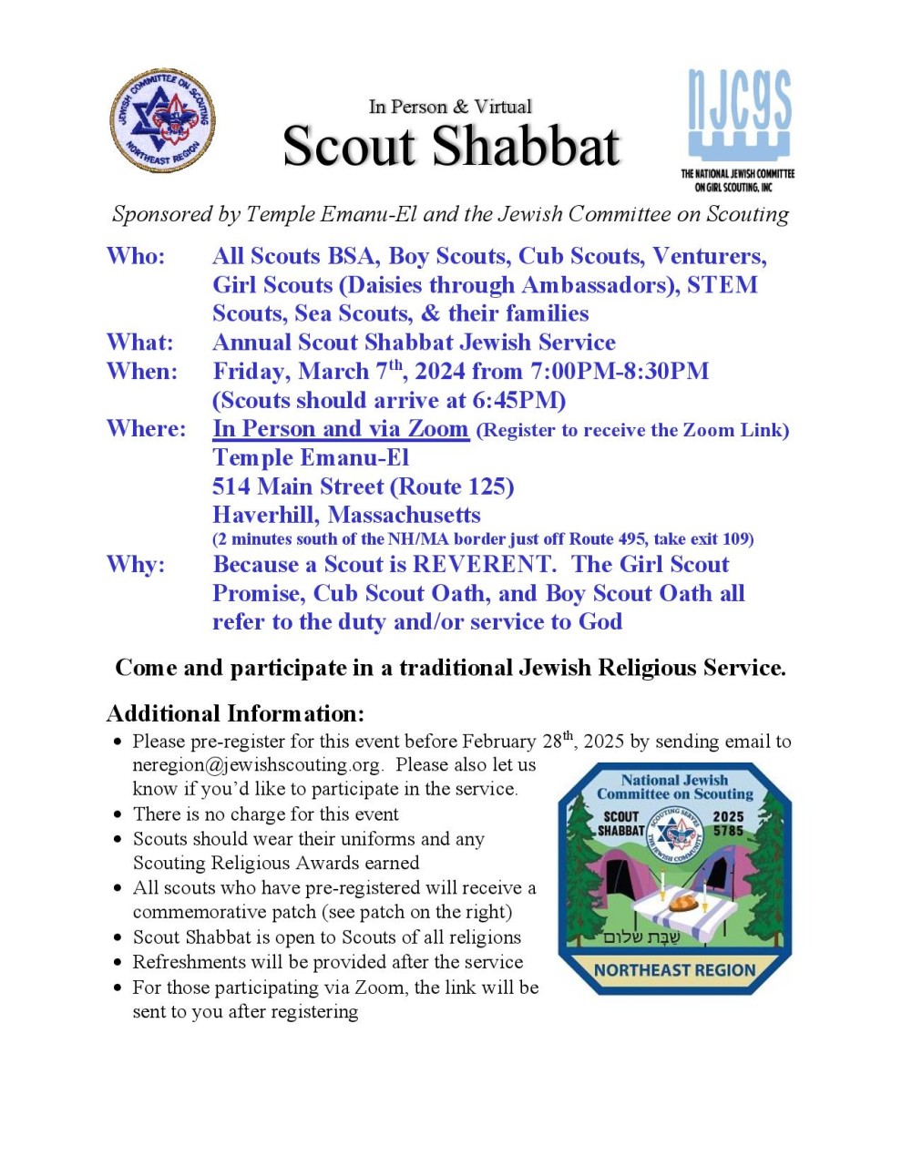 Temple Emanu-El in Haverhill, Massachusetts will be hosting Scout Shabbat on Friday, March 7th, 2025. A handout with all of the information is attached. The Temple is located 2 miles south of the New Hampshire / Massachusetts border, just off Route 495. This Scout Shabbat service will be both in person and via Zoom allowing Scouts and Scout Leaders to participate remotely if desired.