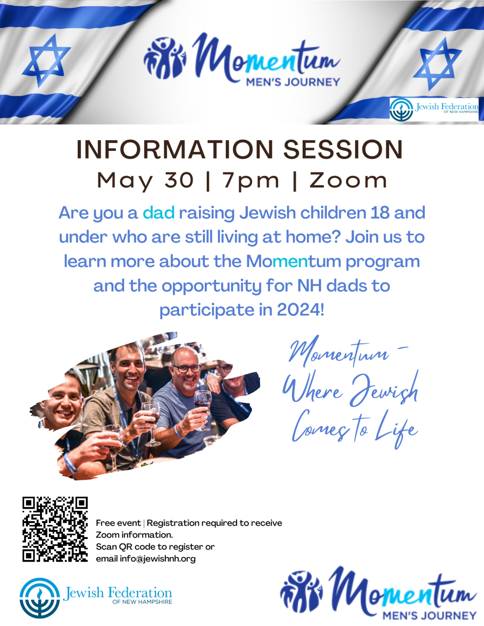 Are you a dad raising Jewish children 18 and under who are still living at home? Join us to learn more about the Momentum program and the opportunity for NH dads to participate in 2024!