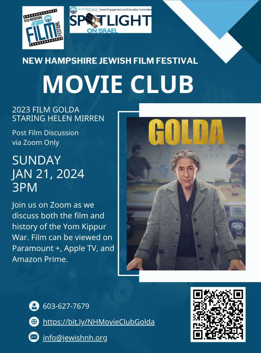 Together the New Hampshire Jewish Film Festival and Israel Education and Engagment Committee will discuss the 2023 film Golda staring Helen Mirren.
