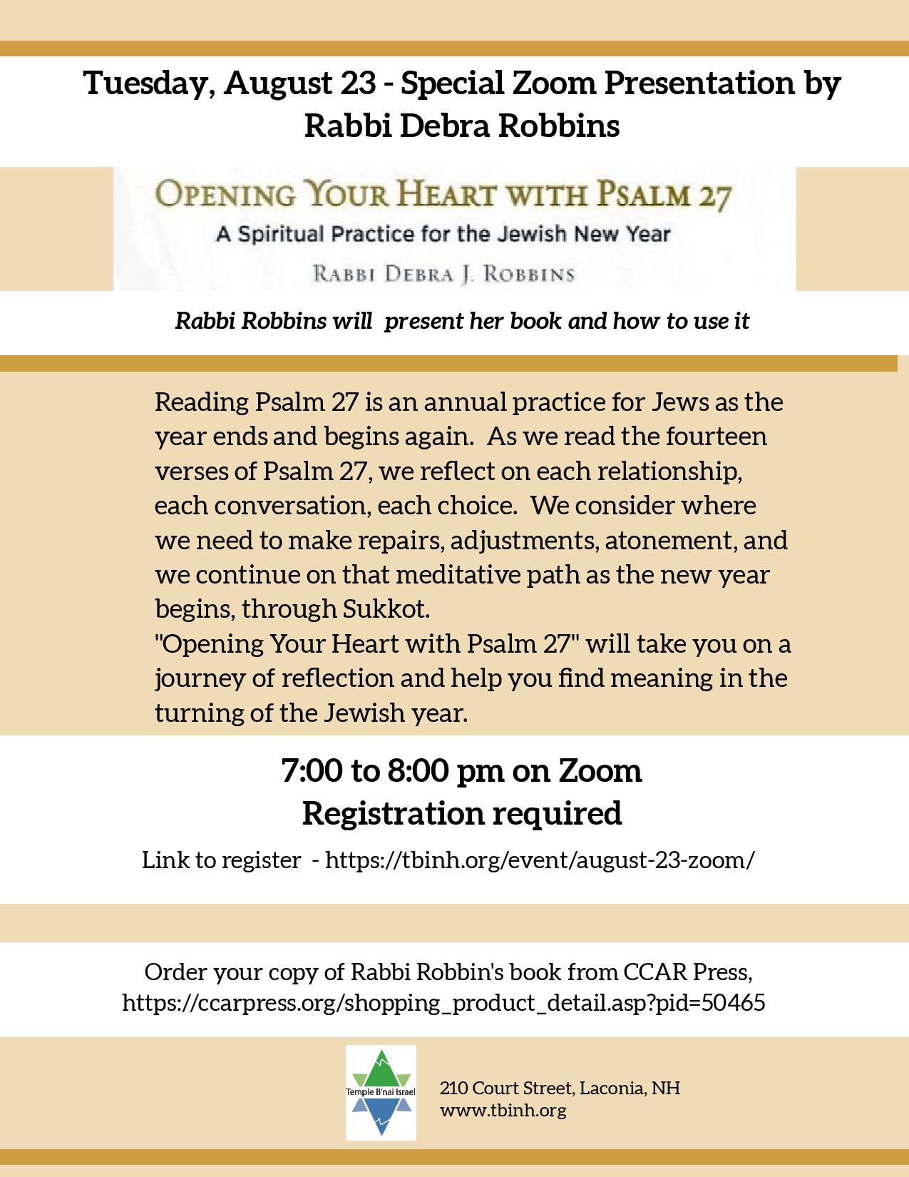 Rabbi Debra Robbins will present her book, "Opening Your Heart With Psalm 27" and how to use it. This is a Zoom only presentation