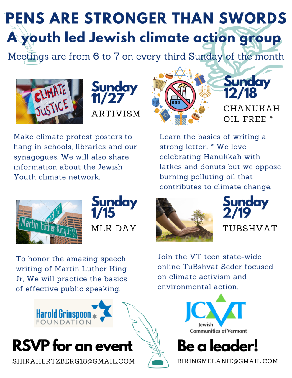 We make miracles through our activism! Get to know other Jewish teens concerned about climate change with some Chanukah taboo ( the game!) and candle lighting. In the second half of the hour, we will learn the basics of writing a strong letter to your local selectboard or legislator and get started on making our voices heard.