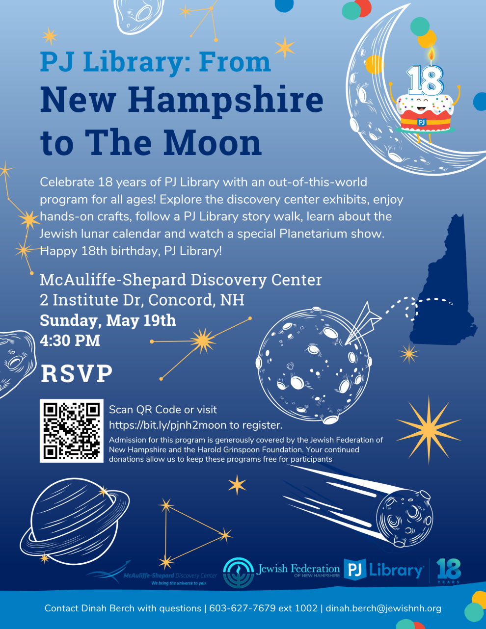 Explore the discovery center exhibits, enjoy hands-on crafts, follow a PJ Library story walk, learn about the Jewish lunar calendar and watch a special Planetarium show. Happy 18th birthday, PJ Library!