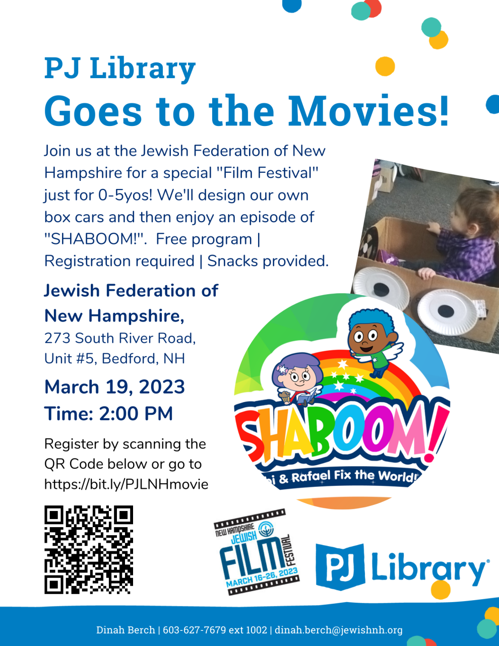Join us at the Jewish Federation of New Hampshire for a special "Film Festival" just for 0-8yos! We'll design our own box cars and then enjoy an episode of "SHABOOM!".