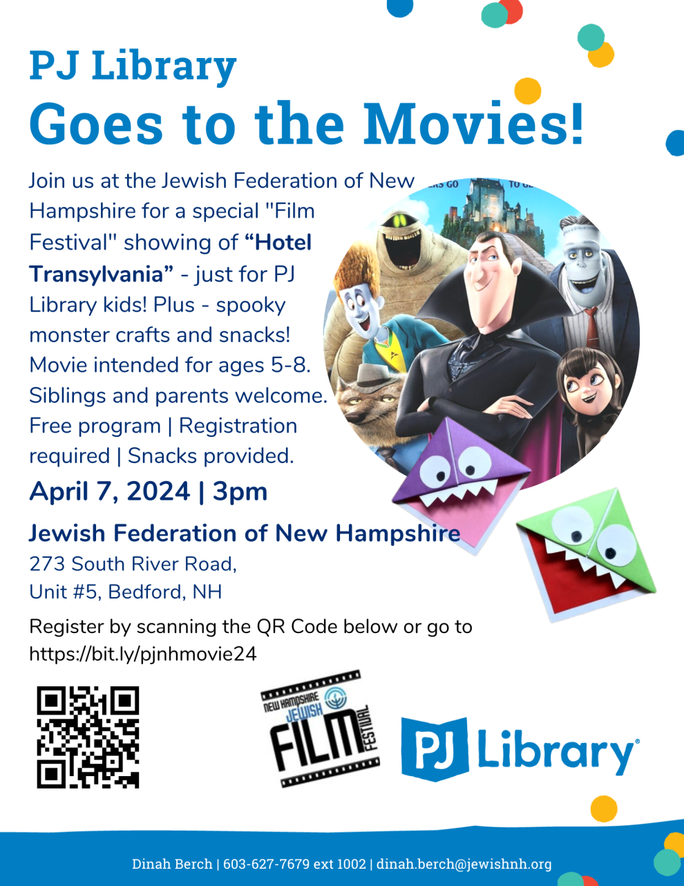 Join us at the Jewish Federation of New Hampshire for a special "Film Festival" showing of “Hotel Transylvania” - just for PJ Library kids! Plus - spooky monster crafts and snacks!