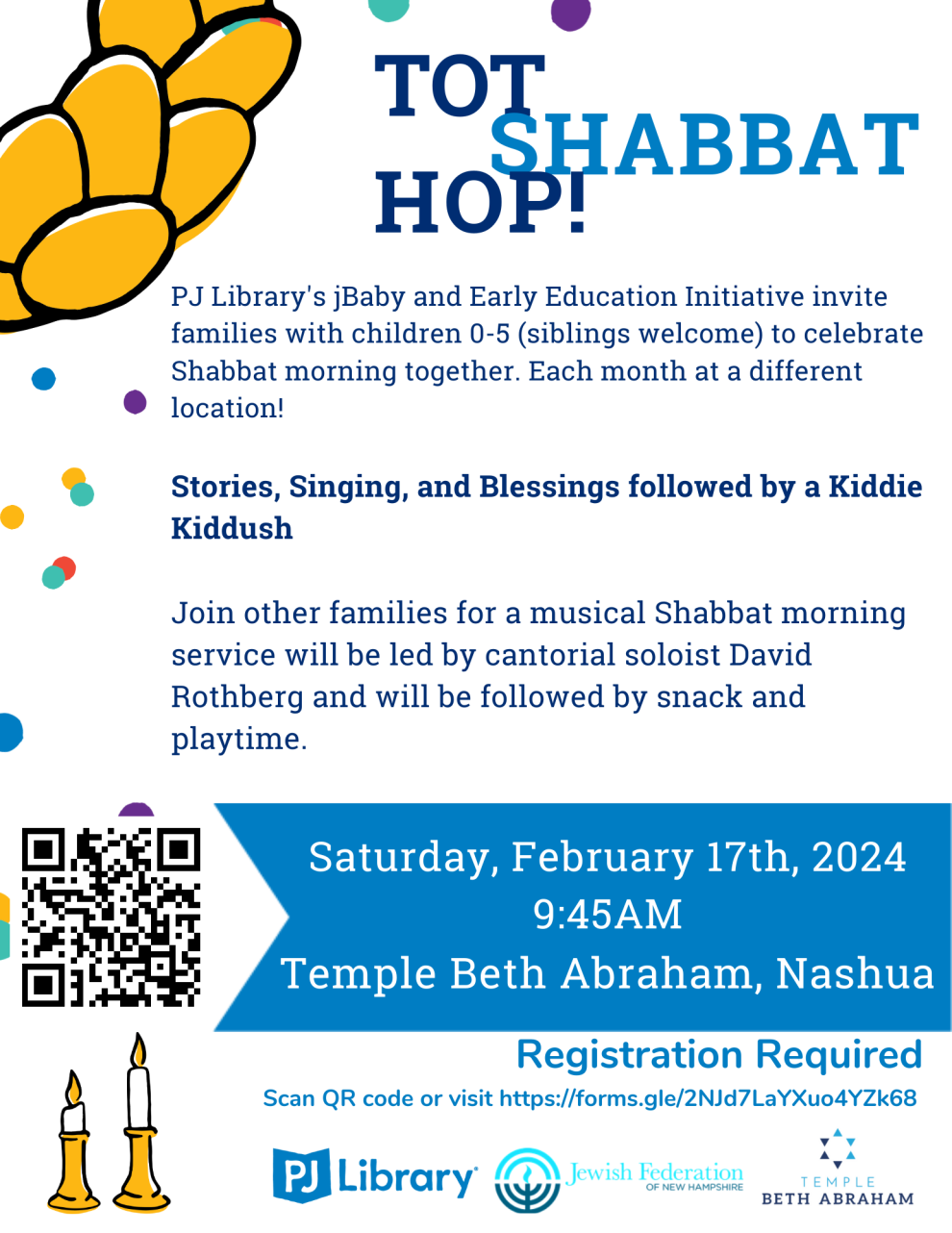 Join other families for a musical Shabbat morning service will be led by cantorial soloist David Rothberg and will be followed by snack and playtime.