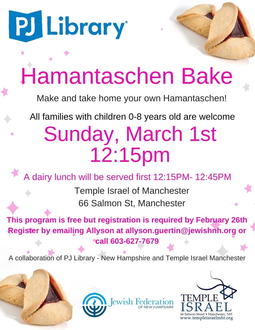 Join PJ Library - New Hampshire and Temple Israel for lunch and a Hamantaschen Bake. Enjoy a dairy lunch 12:15PM-12:45PM and then dive into a Purim craft and make and take your own delicious hamantaschen!