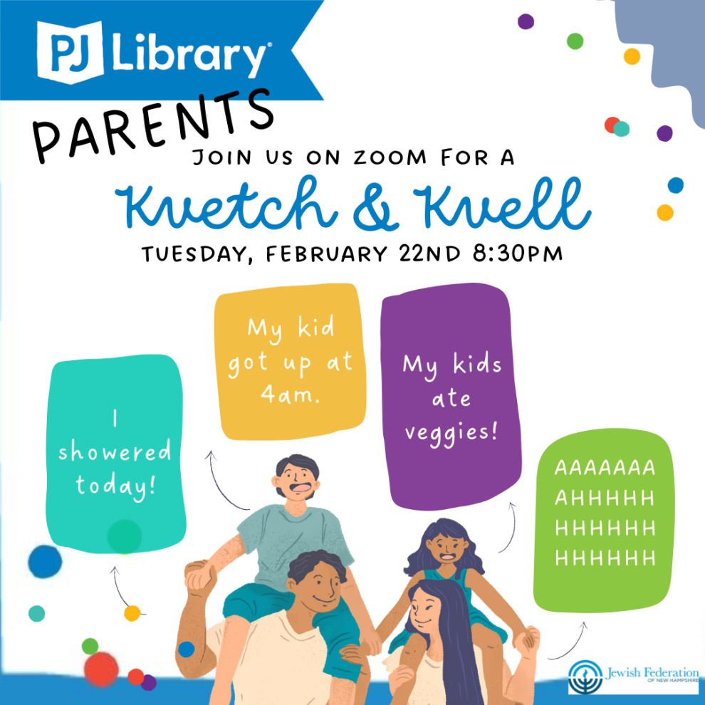 Join us on Zoom for a short shmooze to kvell about recent achievements (like showering) and kvetch about frustrations (why are my kids' socks all over the house? HOW many hamentaschen do I need to make?). Take this opportunity to socialize with other Jewish parents in New Hampshire!