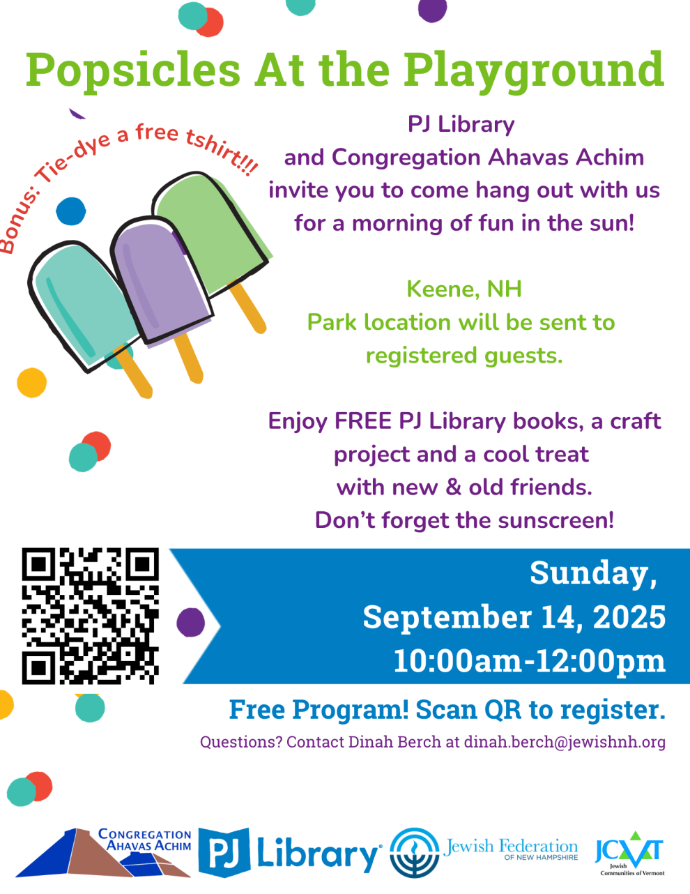 PJ Library is hosting a morning of fun on the playground! We invite families with young children to meet other families, join us for some music and crafts, and cool down with a popsicle treat. Free event! Registration requested.