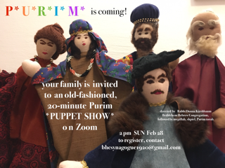 Your family is invited to an old-fashioned 20 minute Purim puppet show on Zoom.