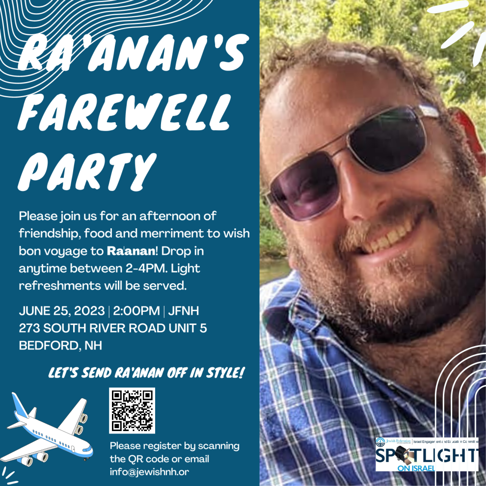 Stop by the JFNH office any time between 2p-4p to say good bye to JFNH Shaliach Ra'anan de-Haas before he finishes his time here in New Hampshire and begins his next journey.