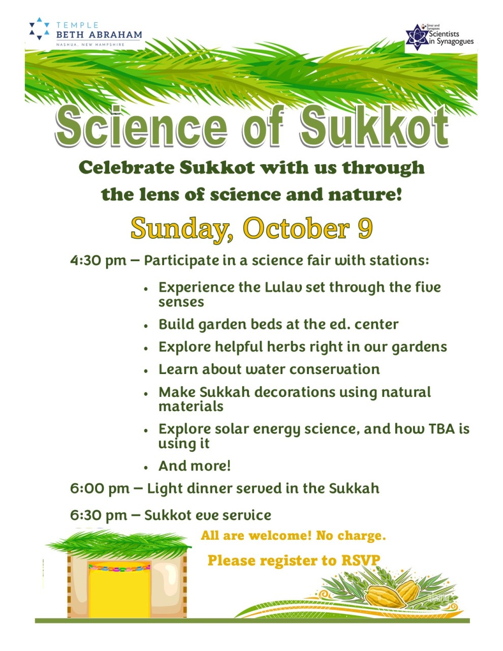 Experience the Lulav set through the five senses, build garden beds at the ed. center, explore helpful herbs right in our gardens, learn about water conservation, make Sukkah decorations using natural materials, explore solar energy science, and how TBA is using it, and more!