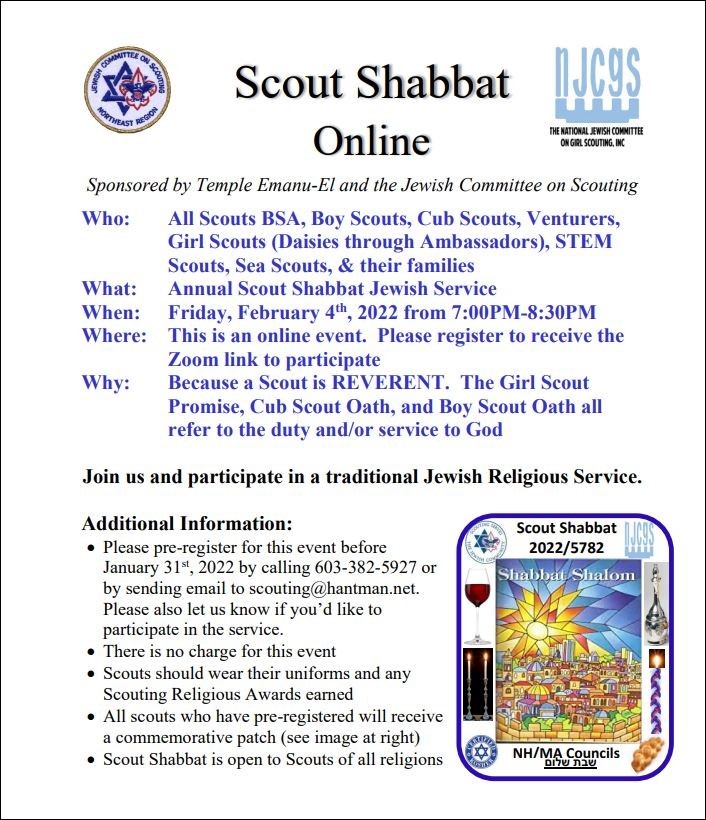 Due to the recent surge in COVID cases, the annual MA/NH Scout Shabbat Service has been changed to an online event. The Service will be hosted by Temple Emanu-El in Haverhill, Massachusetts on Friday, February 4th, 2022 at 7PM. An updated handout for the event is attached. There will not be an in-person service.