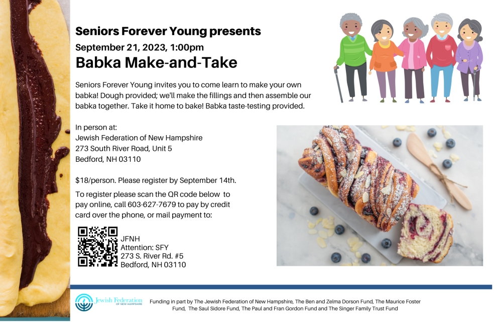 Join us at JFNH to braid and fill your own babka! Dough will be provided. We will make various fillings together and then assemble our babkas. Take it home to bake!