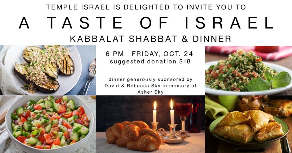 Join Temple Israel Manchester for a Taste of israel, Kabbalat Shabbat and Dinner prepared lovingly by our Kidddush volunteers.