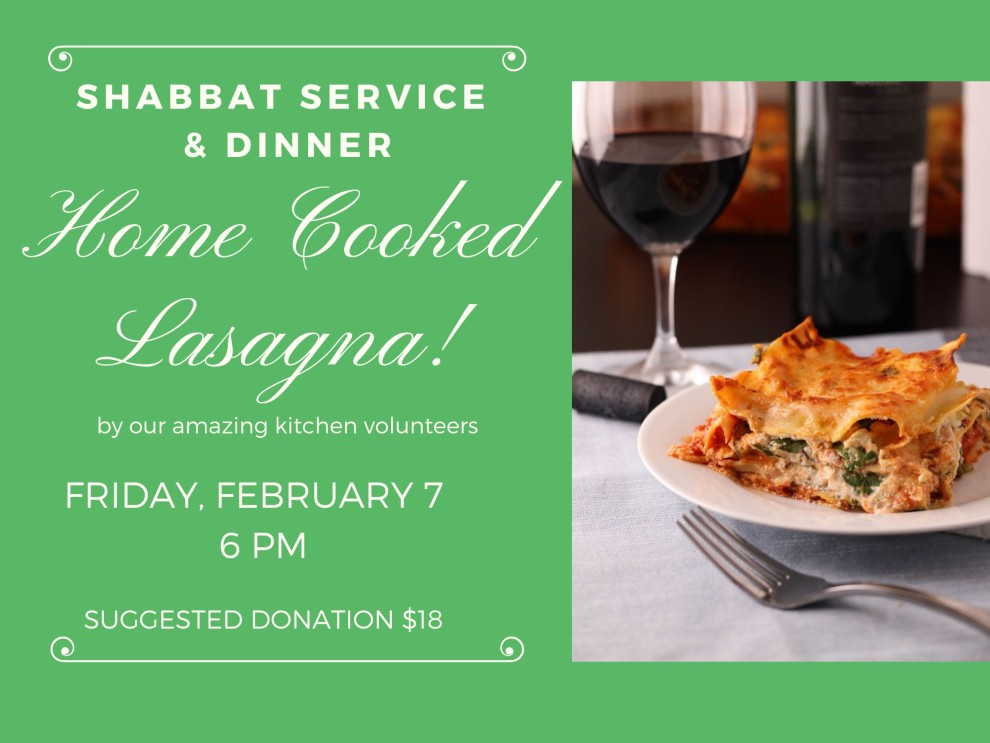 Join us for a Musical shabbat Service followed by a home Cooked Lasagna Dinner!