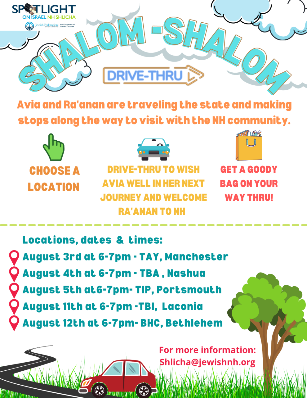 JFNH current Shlicha Avia and incoming Shaliach Ra'anan will be traveling the state together and making stops along the way to visit with the NH community. This is your opportunity to say farewell and Avia and welcome Ra'anan to the NH.