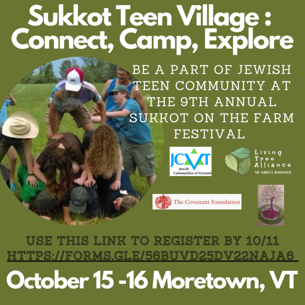 Sukkot Teen Village Registration is now open for our new Teen Village at the 9th annual Sukkot on the Farm Festival. Teens from 12-17 will set up a camping village in the forest and fields of Living Tree Alliance where they will have a chance to cook together, explore the Jewish concept of impermanence, share in relevant Jewish practices, discover the unique role this age group offers to the village and tap into the festival's music and community offerings. Led by Kohenet Yepeth Perla from Roots and Trails, this will be a unique camping retreat and a great way to celebrate Sukkot.... on a farm! This retreat begins at 2:30 pm on Saturday October 15th and will end by Sunday October 16th at 1pm